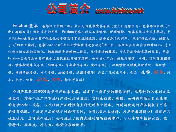 Feizhuo斐卓,以致力于為噴霧技術(shù)傳遞進(jìn)步動(dòng)力為己任!堅(jiān)持自主研發(fā)創(chuàng)新,采用行業(yè)高端設(shè)備和儀器,不斷提升產(chǎn)品的性能,讓斐卓制造的產(chǎn)品能夠完全達(dá)到行業(yè)高標(biāo)準(zhǔn)的要求,實(shí)現(xiàn)國際化的市場供應(yīng)!噴嘴產(chǎn)品及噴嘴的應(yīng)用咨詢熱線:139 1663 9930!