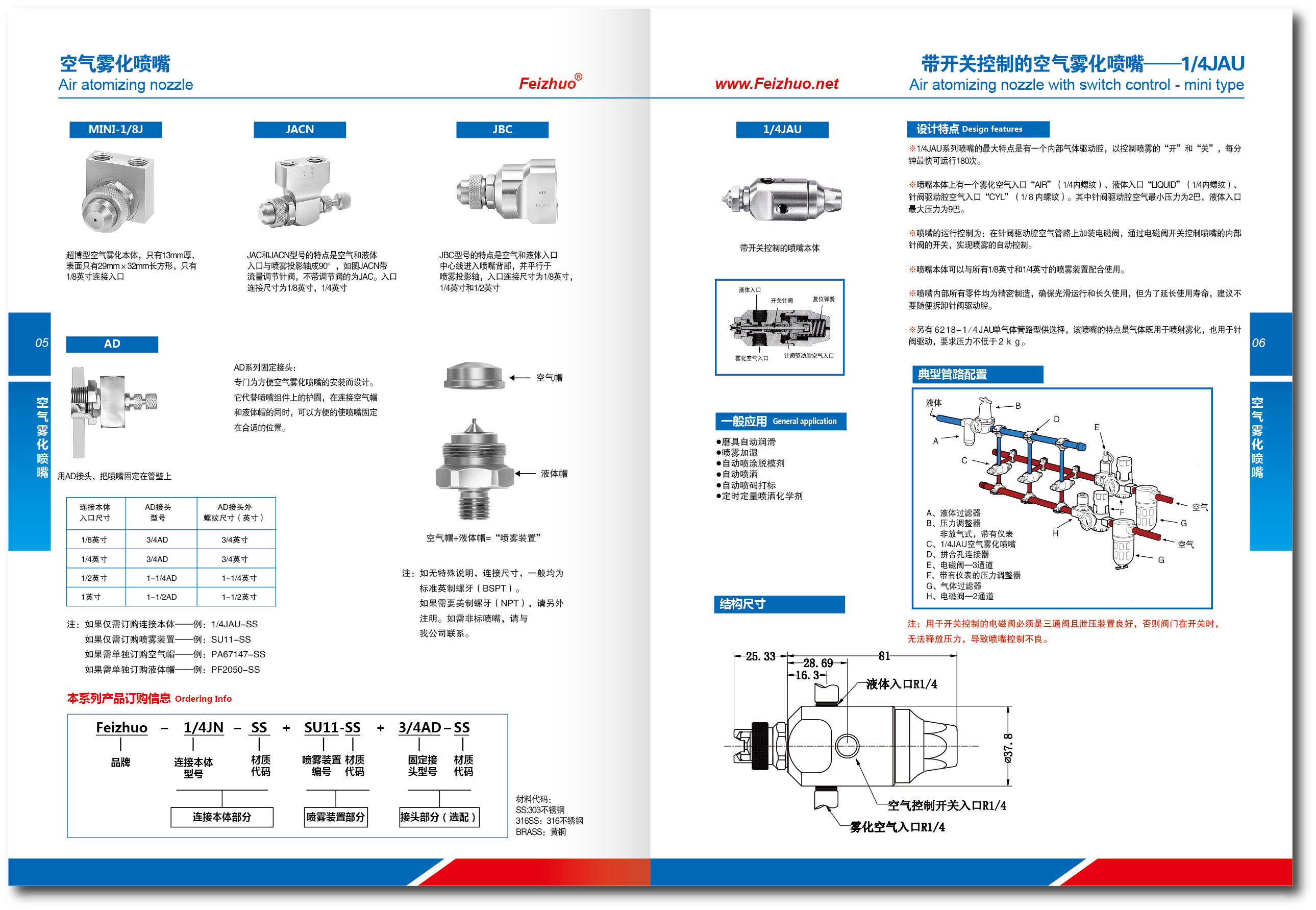 空氣和液體入口中心線進入噴嘴背部,并平行于噴霧投影軸,入口連接尺寸為1/8英寸,1/4英寸,1/2英寸!